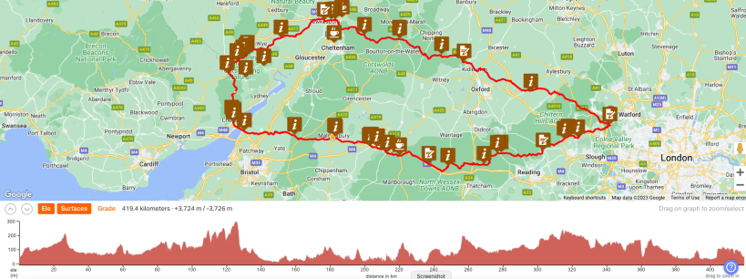 The route isn’t especially hilly although there are some notable climbs in the Cotswolds and at Yat Rock and in Gloucestershire; the achievement comes from getting around within the time limit.